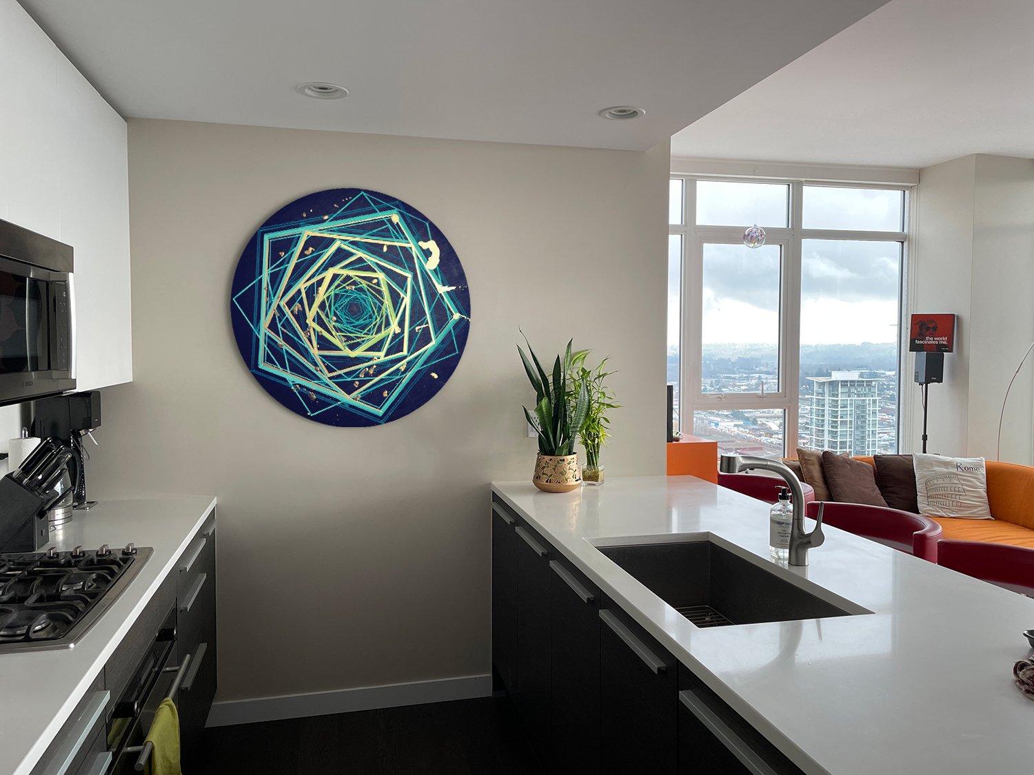 Across this collection of fifteen original mandalas, sacred geometry becomes both practice and prayer—each round panel a portal to spiritual attunement, mindfulness, and the shared wisdom of the collective. Hand‑painted in rich acrylic pigments (with metallic and UV‑reactive accents), these pieces weave universal patterns of harmony that echo from British Columbia to Sweden, Germany, Québec, and beyond. As you gaze into their spirals, star‑tetrahedrons, rosettes, and interlocking lattices, you’re invited into a moment of presence: a pause to reconnect with your own inner compass and the unifying order that underlies all life.