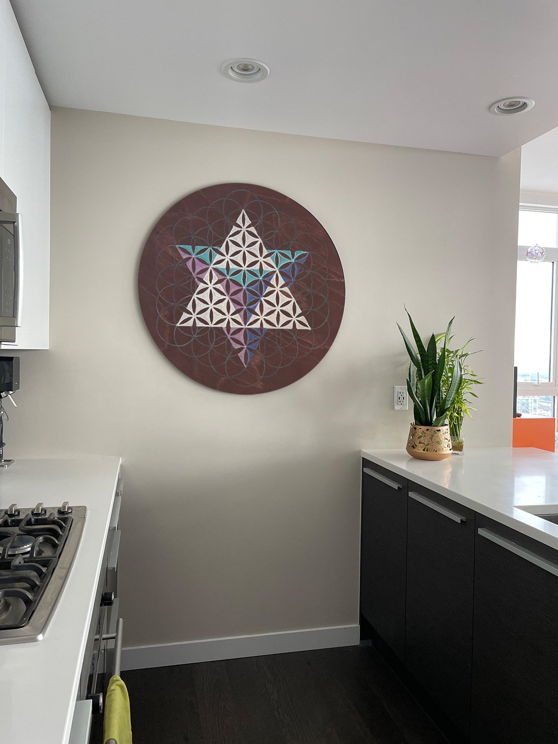 Across this collection of fifteen original mandalas, sacred geometry becomes both practice and prayer—each round panel a portal to spiritual attunement, mindfulness, and the shared wisdom of the collective. Hand‑painted in rich acrylic pigments (with metallic and UV‑reactive accents), these pieces weave universal patterns of harmony that echo from British Columbia to Sweden, Germany, Québec, and beyond. As you gaze into their spirals, star‑tetrahedrons, rosettes, and interlocking lattices, you’re invited into a moment of presence: a pause to reconnect with your own inner compass and the unifying order that underlies all life.